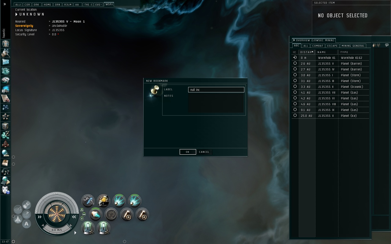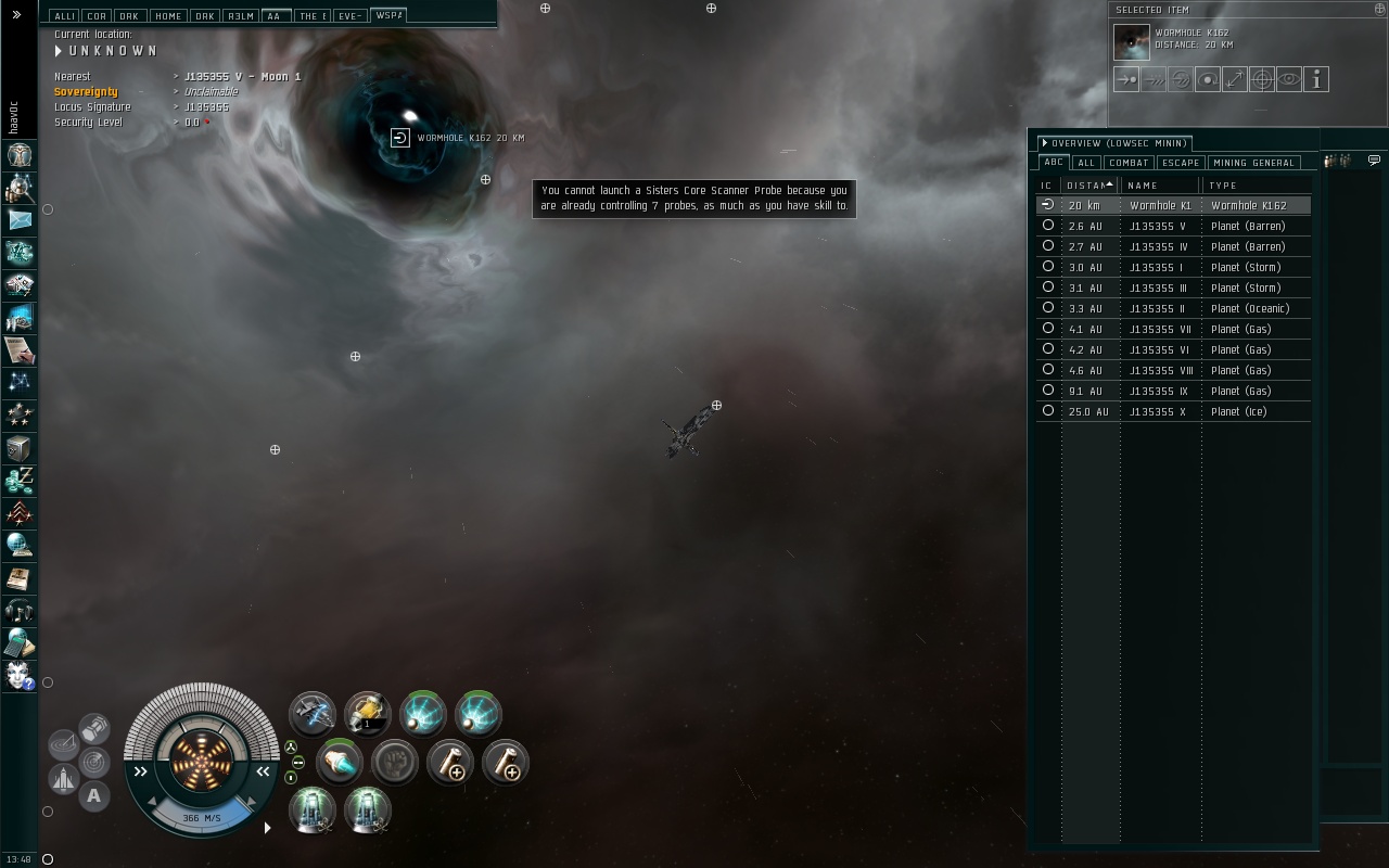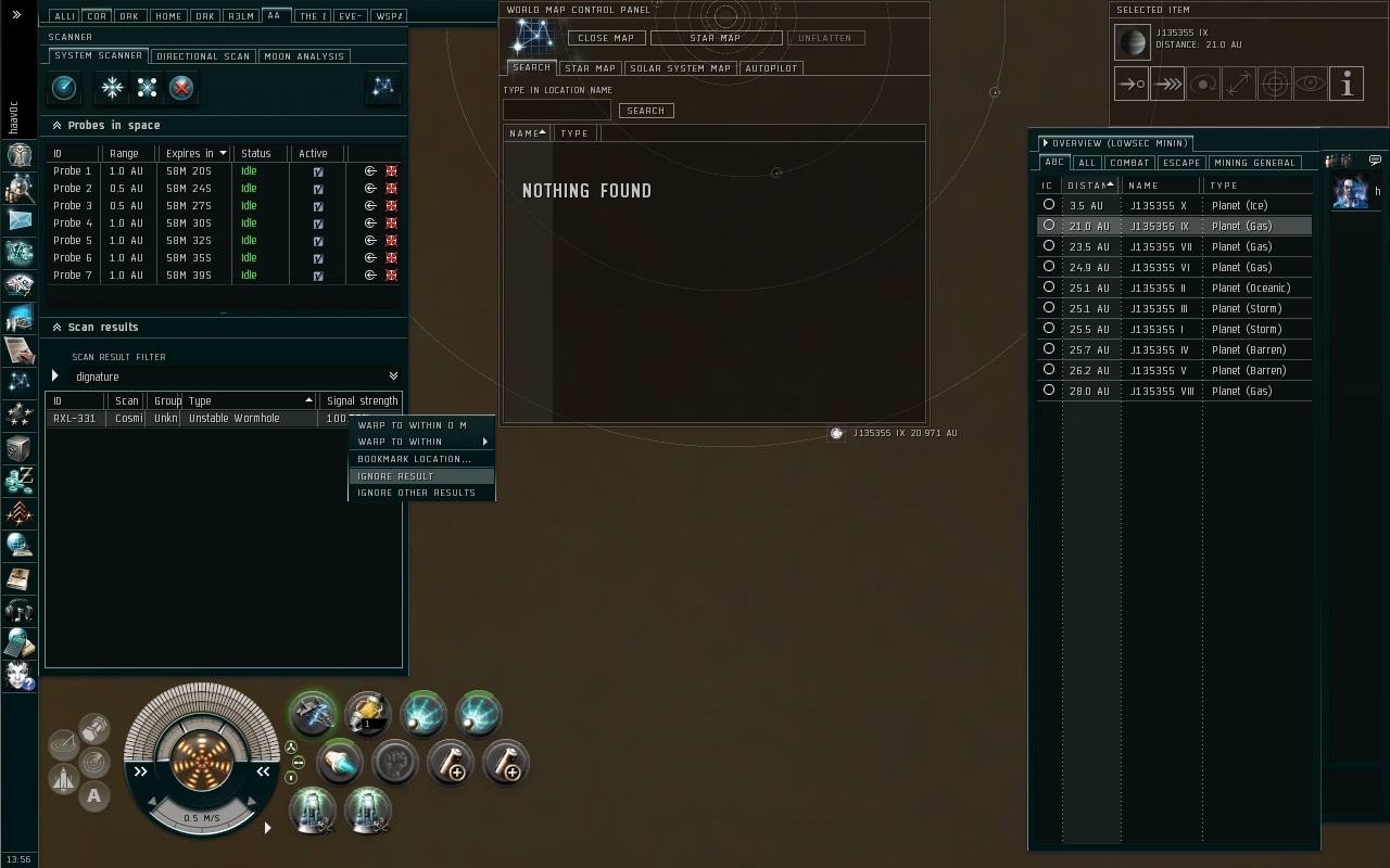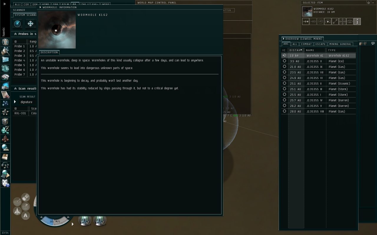 After launching probes, get away from the WH. It takes only one smartbombing BS to ruin a cloaky’s day. I like to stay about 30-40km away, close enough to run back in in good speed but far enough away that it is highly unlikely that you’ll be decloaked by random jerks. Try to either keep in constant motion or not be between a celestial and the WH, because a ship warping in sometimes decloaked you when he goes through your ship at several thousand kilometers/second.