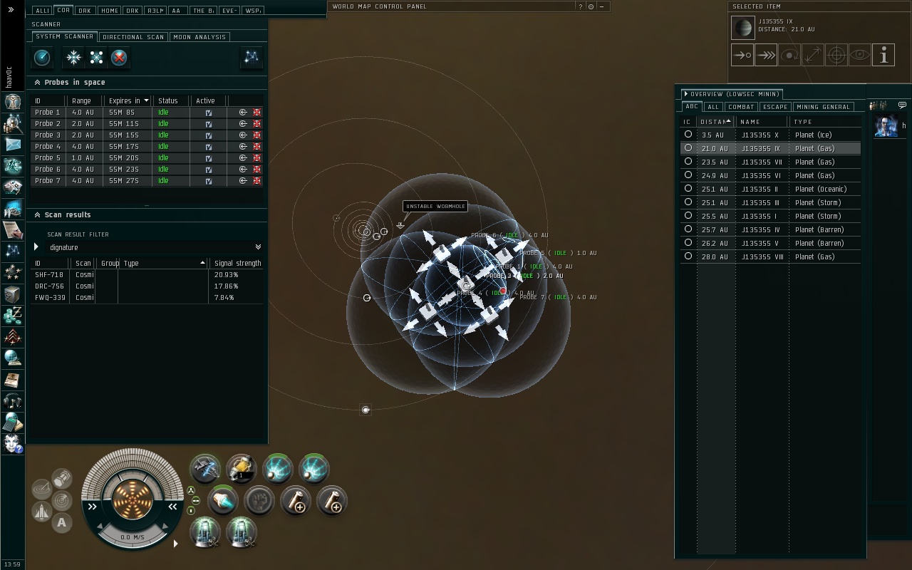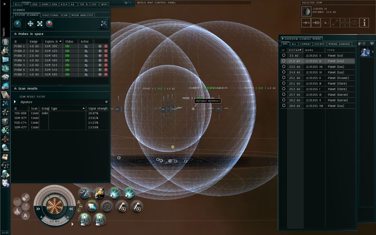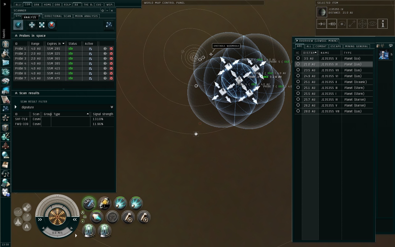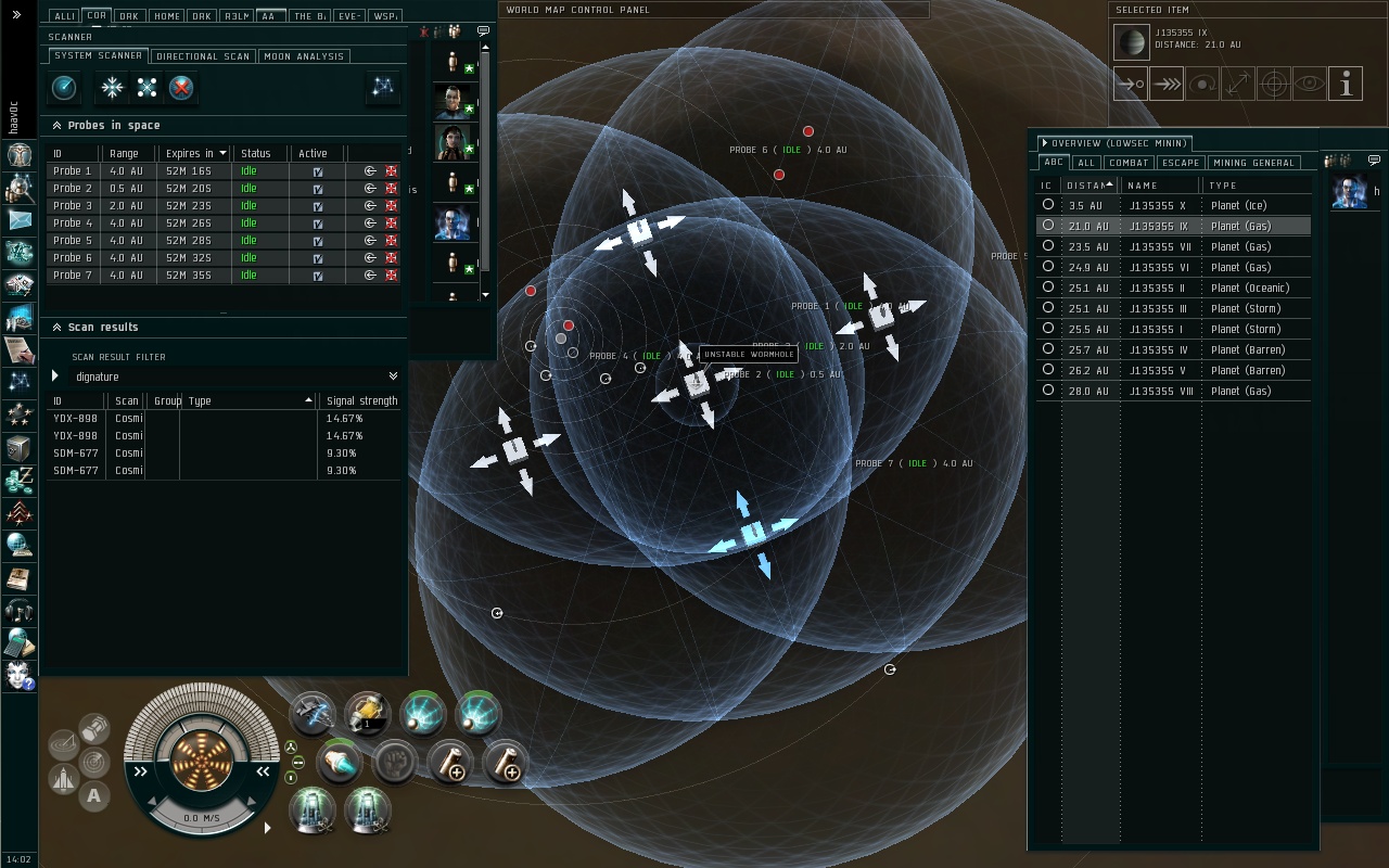 Posted: 2010-05-30 Filed under: eveonline, wormhole 8 CommentsScanning, argued as being the only thing in Eve that takes skill, is a fairly integral part of WH life; to the point that if you can’t, and you’re alone, you’re dead. With that in mind, here is my guide to scanning. You’re