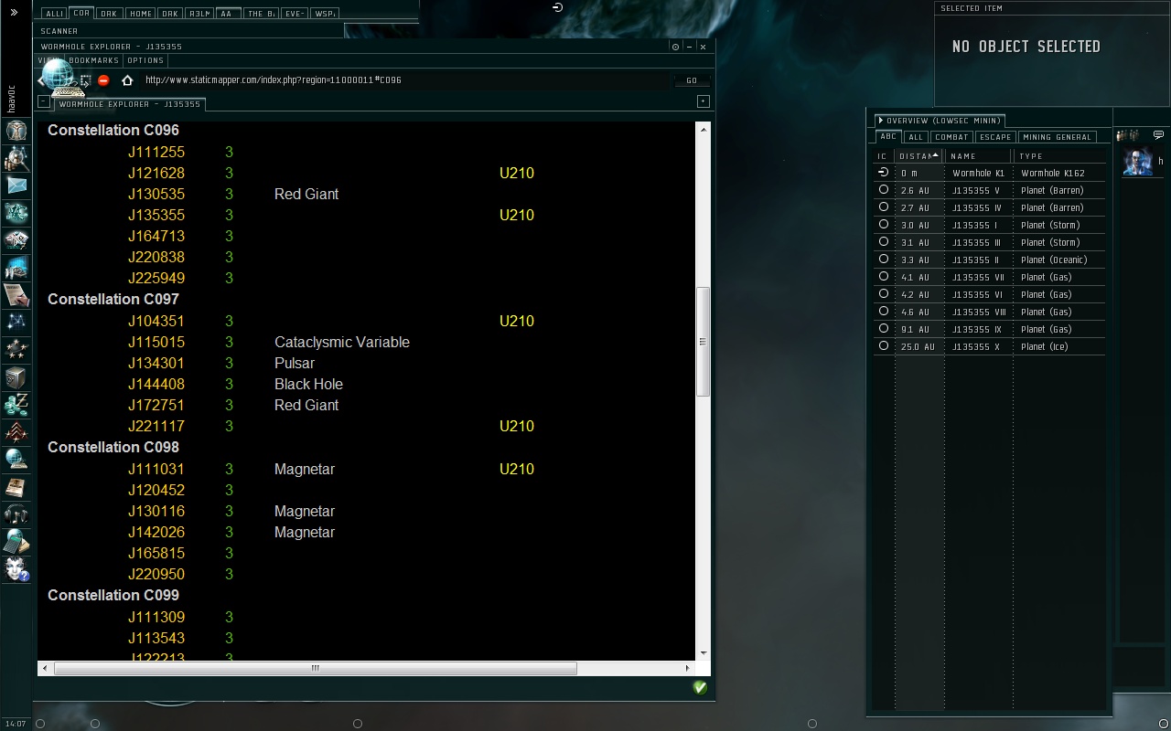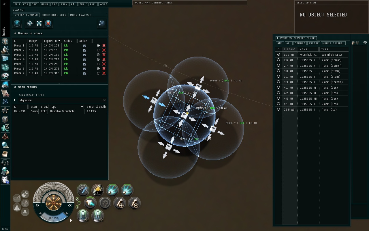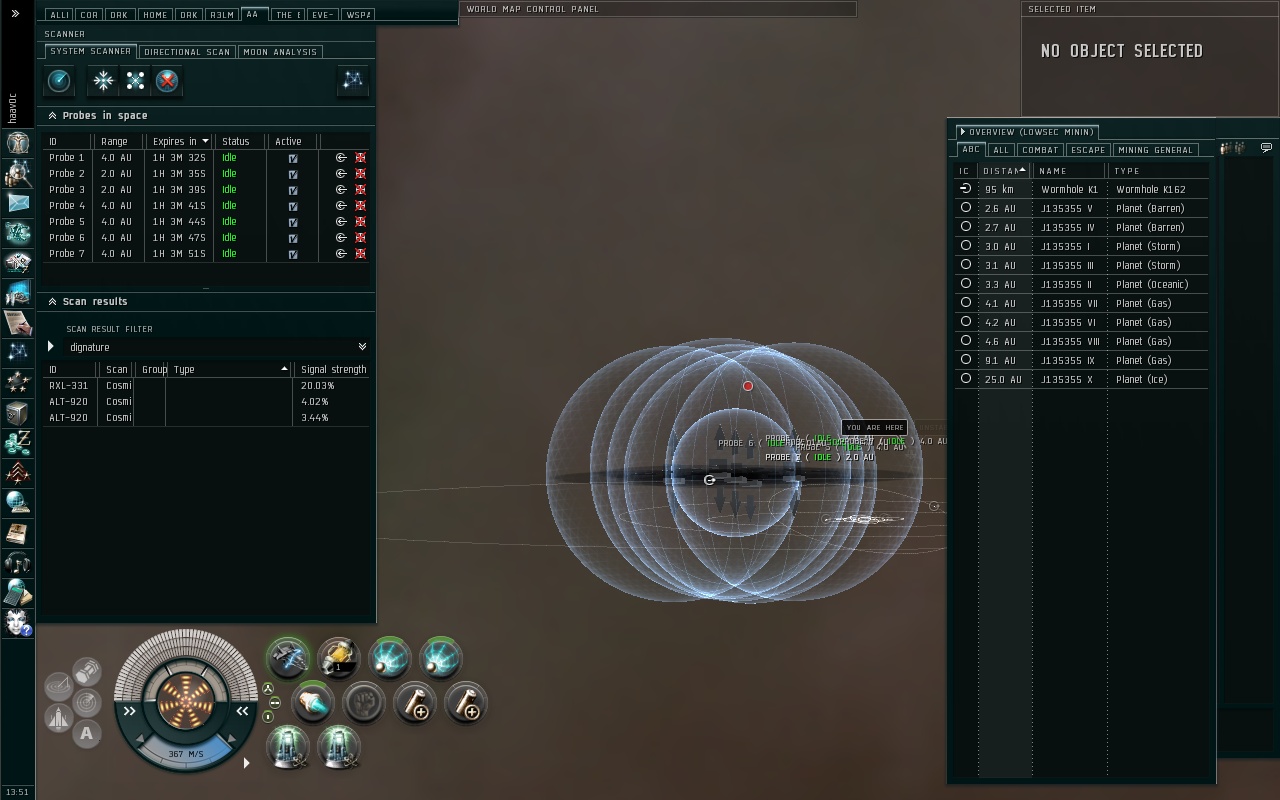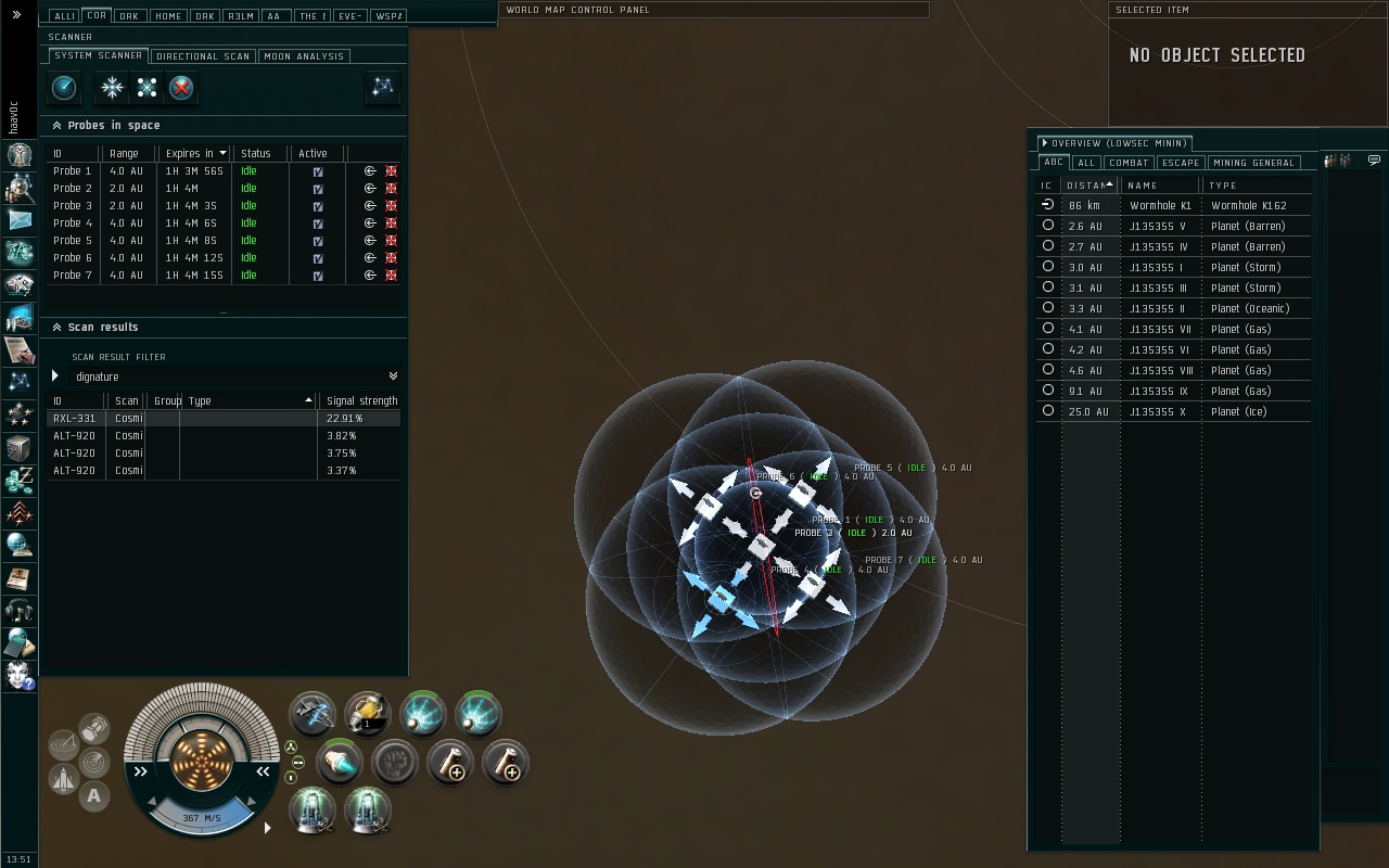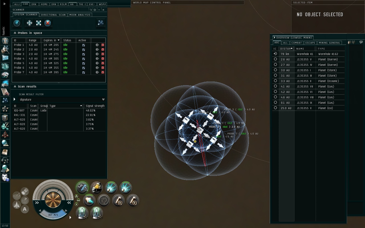Posted: 2010-05-30 Filed under: eveonline, wormhole 8 CommentsScanning, argued as being the only thing in Eve that takes skill, is a fairly integral part of WH life; to the point that if you can’t, and you’re alone, you’re dead. With that in mind, here is my guide to scanning. You’re