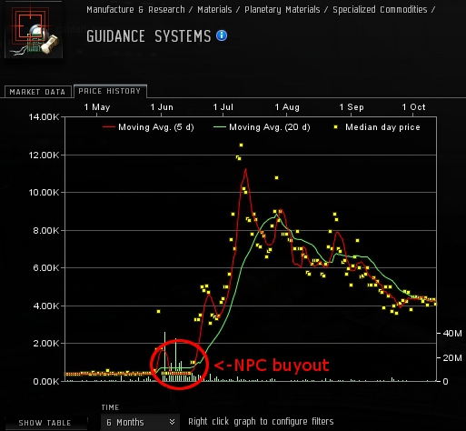 Price of Guidance Systems will slowly climb up and crash as people who have stockpiled millions of units take profits. Eventually when the pre-Tyrannis stockpiles run out, we will see the price climb to the expected 25,000 ISK.