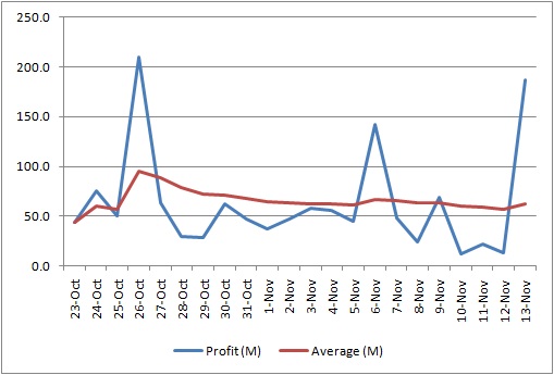 I’ve been trading in a new market for the past 22 days and am averaging 62.4 M / day in profit.