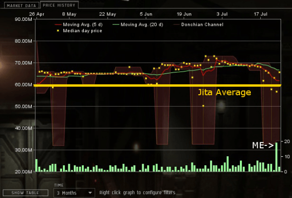 Posted: 2011-07-25 Filed under: market 3 CommentsOne of the popular items that I sell has been slowly dropping in price due to an influx of new traders. The Jita average is about 58-59 M. Over the week, the price slowly fell below Jita prices to around 57 M.