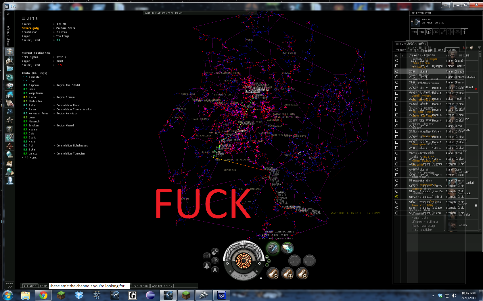So, ass end of nowhere and very little to speak of a JB map. Screw it, I grab my orca (Lebius II, Lebius I being lost to russians who fleetwarped me into a gang one sleepy morning) and prepare to jump all the way down there, starting from the staging system keb….keber…kebi… kibbers. Yeah, that sounds right. I manage to get all my assets shoved into the orca, all the alts down to Kibbers hours before we get into the alliance and the wardec that they mentioned but we forgot goes live.