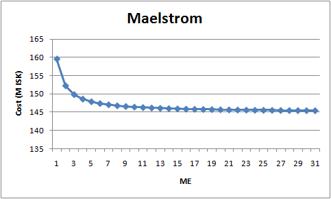 There is a diminishing return with each ME level as it is a logarithmic trend. For a Maelstrom the ‘optimal’ ME is around 15, which is about 2 months worth of research.