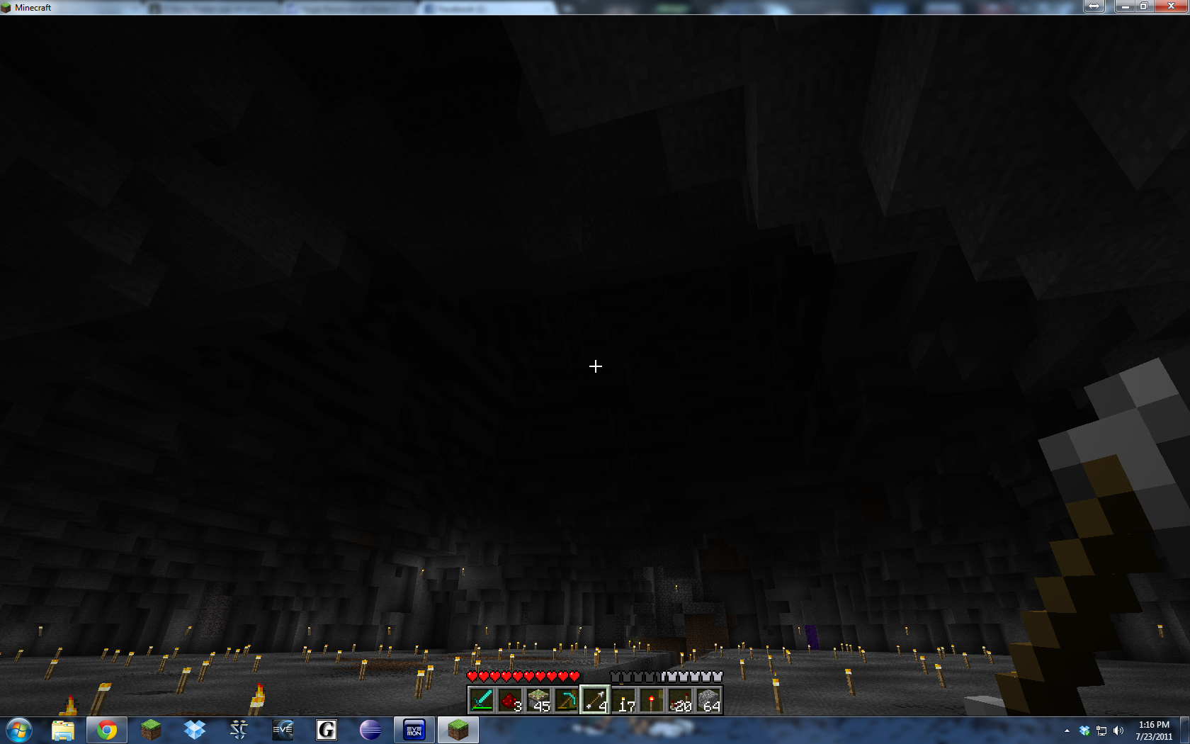 I tab back after a while and oh hey, Raath’s in local. We wave in another channel, and he asks me the gate status. We compare options and ships, as he’s in an executioner and I’m in a viator. We bounce various ideas back and fourth, and at some point I warp to him at a safespot. I tab back to minecraft and make the cave a little bigger. Tab back, and he’s talking again about how he warped to gate at 100km, got killed but didn’t get stuck in a bubble so I should be fine.
