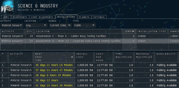 Posted: 2011-08-25 Filed under: industry, pos | Tags: lowsec, me, pirate, pos, research 11 CommentsIn Empire space open Material Research slots are notoriously hard to find. To view Public slots in your area, go to your Science & Industry section, Installations tab, filter by Material Research / Any / Current Region / Public. This will show you just how full the slots are.