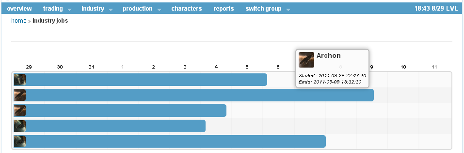 Solution: Use the Corporation Industry Jobs API to display a visual aid of capital job production progress as to easily tell when BPOs will be idle