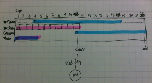 Blake often comes to me with a “I need this thing. Can you make this thing?”, to which I often pause and perform what I like to call shriveled programmer stare. This maneuver involves me scrunching my face as much as possible, raising one eyebrow, and giving a bit of a pained look. I’m quite sure I gave this look when the idea was first proposed. The basic idea actually is just a Gantt chart. I have x number of capital ships in production at any given time and I would like to know exactly, at a quick glance, when they come out of the oven so the next batch of parts will be ready. Simple enough, on paper. The real question is implementation.