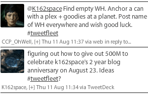 Posted: 2011-08-31 Filed under: eveonline, wormhole | Tags: PLEX, wormhole 20 CommentsTwo years ago a corpmate responded to my boredom comments in corp chat with an offer to come join him in the new frontier known as Wormhole space. I dove in headfirst with nothing to my name but a Covetor, a Dominix, and some 50 M in ISK.