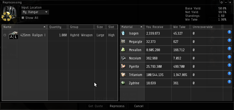 Using only 425 Railgun I’s will leave you with a disproportional lack of Tritanium for battleship builds. Other items, such as the Passive Targeter I, can be used to balance out your needs.