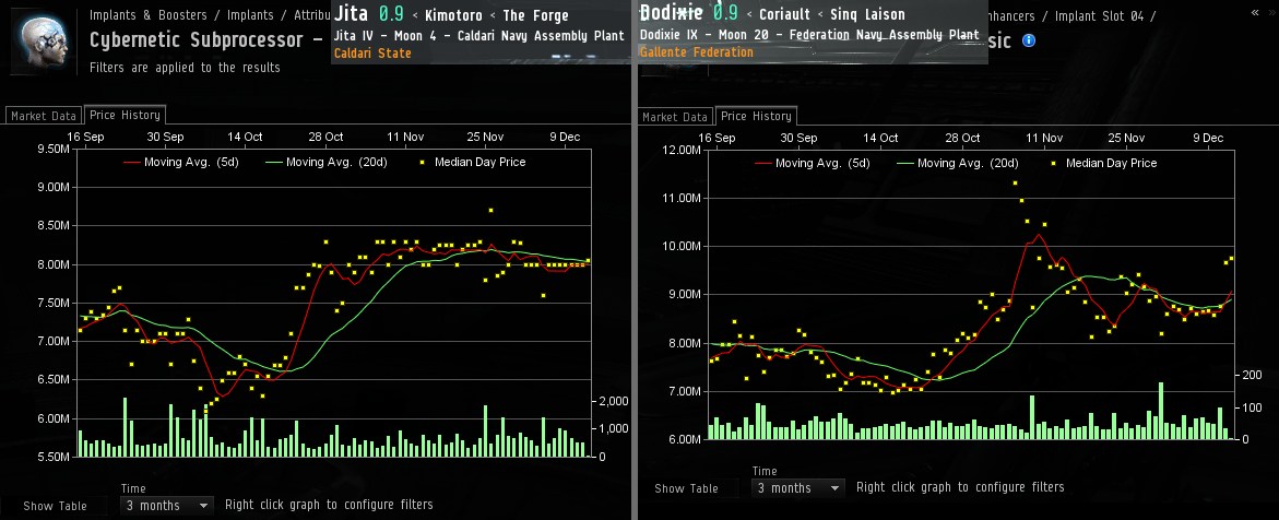 2. Gauging profit potential is rather easy. Take the current Jita price and the last average price you have in Dodixie. Use the movement of the region of the month