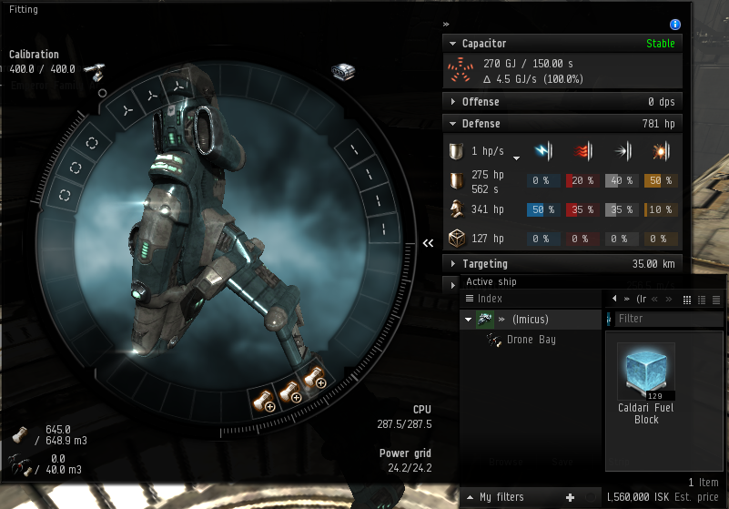 I present to you my hauling Imicus. This beast is capable of hauling 129 Fuel Blocks (just over 6 hours of fuel time for a Medium POS), no DPS, and terrible align times.