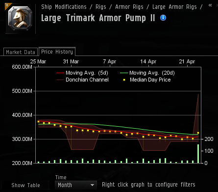 Now is the time to put Tech 2 rigs into your capital before the expansion hits as they will not be unfitted after the patch. The Jita market was quick to adjust given the new build requirements with Large Trimark II’s climbing to 488.9 from around 300 M.