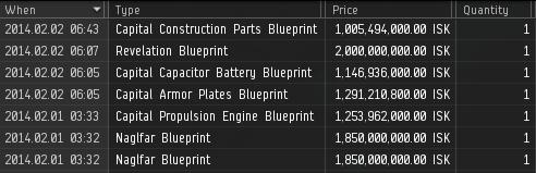 Posted: 2014-02-10 Filed under: industry, ships | Tags: naglfar, revelation Leave a commentGiven the growing popularity of Naglfar and Revelation hulls, I made a decision to expand the Dreadnought production line by adding more blueprints. The total for 2x Naglfar, 1x Revelation, and additional component BPOs to balance the ratio of blueprints came out to 10.397 B.