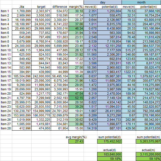 I wanted to test out my market research so I setup shop in a station and started to import items. In my test region, I’m successfully getting 59% of the total traffic for the region given the items I am targeting bringing in on average 103.8 M profit/day, or around 3.1 B/month.