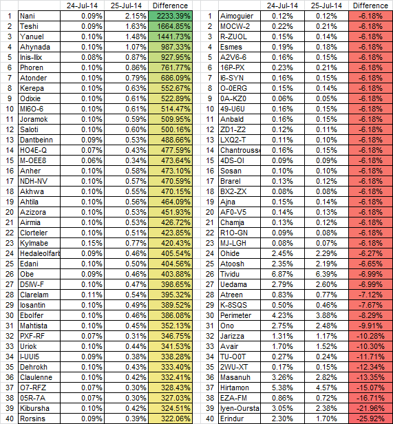 Posted: 2014-07-29 Filed under: industry | Tags: crius 5 CommentsThe color shift indicates that manufacturing is spreading out and the landscape is starting to adjust to new levels. 67 systems have gone up more than 1% and 21 are down more than 1%.
