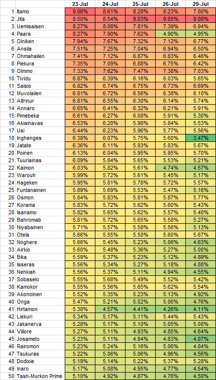 Posted: 2014-07-24 Filed under: industry | Tags: crius 3 CommentsLooking at a 24 hour range in the manufacturing index data, it looks like people have started to move out of major manufacturing centers as the top 50 list has showing a drop across the board.
