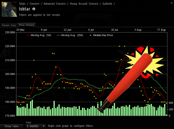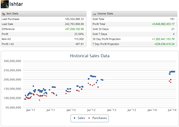 Posted: 2014-08-25 Filed under: Uncategorized | Tags: hyperion, ishtar Leave a commentIshtars have always been a solid performer, generating on average about 31.2M profit per trade. The nerf coming in the Hyperion release doesn’t phase me. I’ve learned that you have to roll with the punches and not let adjustments like this impact your overall trading strategy. Items move in and out of popularity over time. I’ll just stop working with the Ishtar hull for a while and see how demand changes over time.