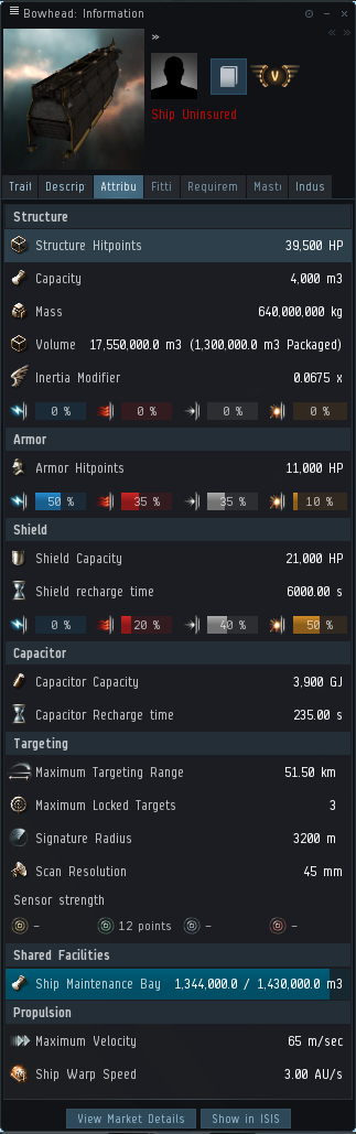 Posted: 2014-11-27 Filed under: ships | Tags: bowhead, ore 7 CommentsThe Bowhead is a great addition to the Eve lineup. I finally got the chance to play around with the ship on the test server today. I’m excited to see these around space and on killboards.