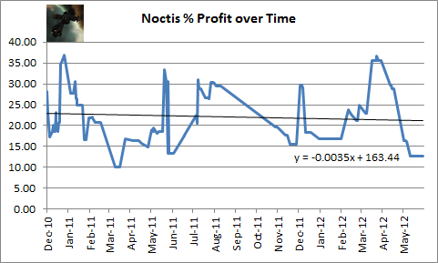 Source Data: I picked the Noctis because I have data for 188 sales ranging from Dec/2010 to June/2012. I wanted to look at the Tier3 Battlecruisers, but I lack enough trades on these to be statistically meaningful.