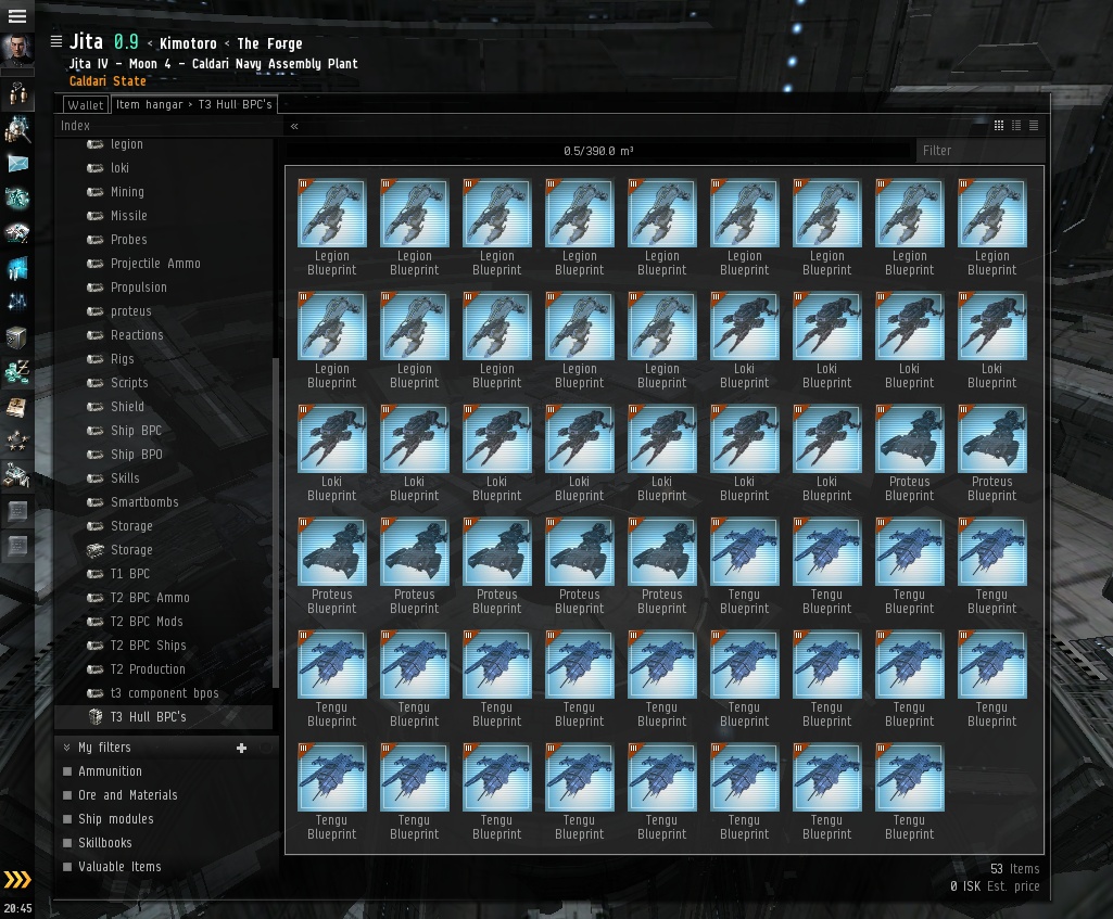 Posted: 2012-07-08 Filed under: industry, ships | Tags: bpc, legion, loki, pos, proteus, sleeper, tech 3, tengu 3 CommentsIn addition to the massive stock of Subsystem BPCs that I recently acquired on a bulk deal, I have also picked up a large amount of Tech 3 hull BPCs.