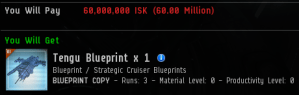 The bulk deal was for enough BPCs to make 443 Hulls. The average BPC price per run on the deal came out to 18.35 M. On public contract right now, a Tengu BPC is trading at about 20-25 M/run.