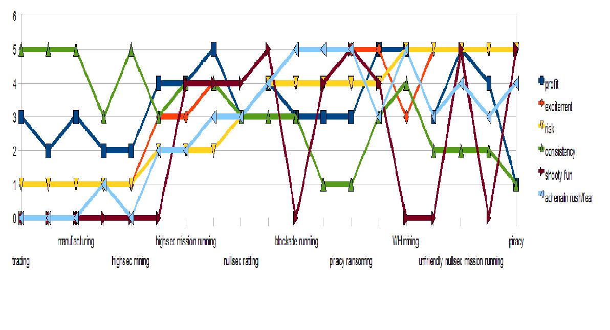I feel that nullsec changes are going to take that graph and break it over it’s knee. In friendly nullsec, which is where miners would usually go, I’d assume, there is very little risk. Admitted, you can’t AFK mine, but you’ve got local and you’ve marked every space-tree for 5 systems in every direction. If someone who wants you dead even thinks about scanning you out and killing you, you have about 5 minutes notice to warp out and maybe go back and get the jetcans too. This safety while still getting nice lowsec ores and the occasional nullsec, depending on how deep you are, is again balanced by you having fought tooth and nail for every damn inch and someone could bring in a fleet of dreads at any second and kill everything you’ve ever worked for. If I’m reading this change correctly, then for every system you control and upgrade, you’ll be able to get up to five very, very rich belts full of ABC, which can then be mined at much less risk than WH mining, which then can be hauled out through friendly nullsecs and sold, or used to build more dreads that can be used to scare the hell out of your neighbors or be used as space-lawn furnishings or whatever.