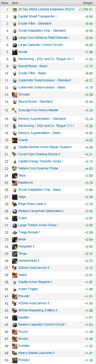 I spent a lot of time looking at items that are consumed for mission runners, PVP, and nullsec fleet doctrines.