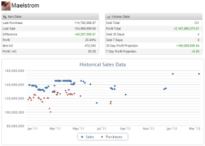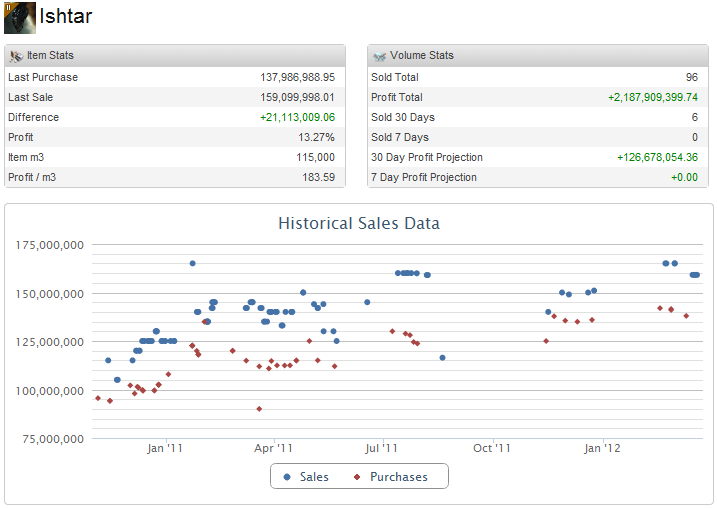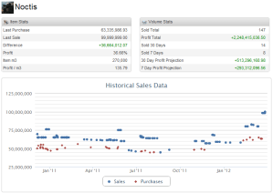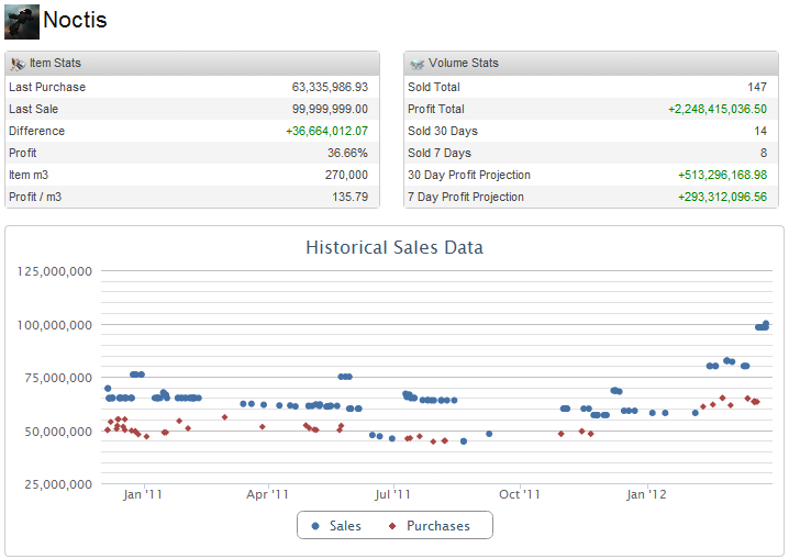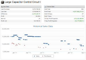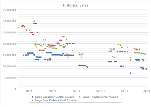 Posted: 2012-10-22 Filed under: industry, market | Tags: api, industry, trade 65 CommentsIf you haven’t been following this blog, I’ve periodically posted about a “Wallet Manager” project that myself and my trading partners, Raath and James, have been working on for the past two years to help us manage our Eve activities using the Eve API.